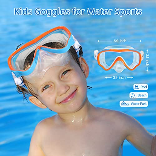 🤿【Ultra Clear & Anti Fog】This kids goggles use tough tempered glass lenses(adopt explosion-proof film for safety), which can restore the underwater world in 180° panoramic HD without distortion, giving children a full sense of security. The inner lens adopts the latest anti-fog technology, which can quickly evacuate water mist and make the vision clearer. (Do not throw the swim goggles to the floor or jump into the water with the goggles on to prevent the glass from shattering)