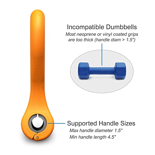 LIGHTWEIGHT AND PORTABLE: At less than 1 lb, Kettle Gryps easily pack in your gym bag or carry-on for use in any gym or hotel workout room. Compatible with most adjustable dumbbells and nearly all standard dumbbells with bare metal handles (max 1.5″ handle diameter, min 4.5″ handle length). Does not fit most vinyl or neoprene coated dumbbell handles because those are often too thick and/or too short.