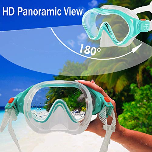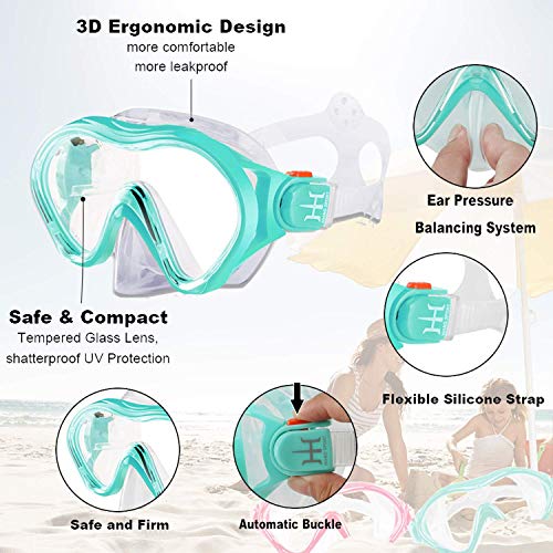❥FOOD GRADE SOFT SILICONE, SAFE & DURABLE❥ The characteristics of this material are: safety, environmental protection, heat resistance, aging resistance. So it makes this kids snorkeling gear more safe for skin, make this snorkel mask has a longer lifespan and really comfortable when wearing