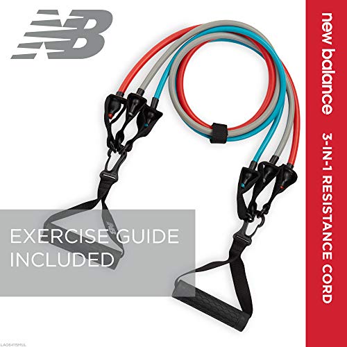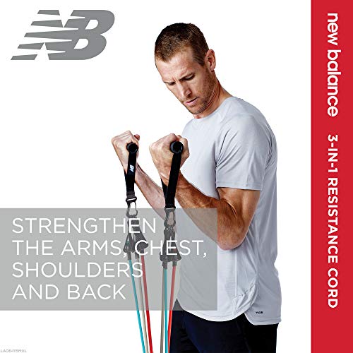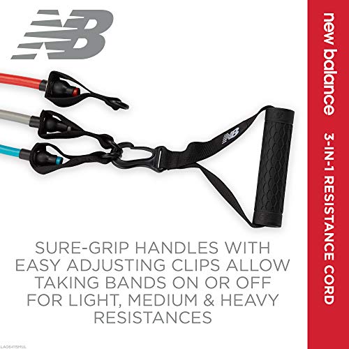 New Balance Exercise band kit offers 3 interchangeable resistance cords (Light, Medium, and Heavy) for progressive intensity as you get stronger with easy-adjust clips to add or remove bands for desired resistance levels. Foam handles offer a comfortable secure grip for superior leverage and support – and a secure strap to keep bands secured together. Ideal for arm curls, triceps kickbacks and front arm raises at home or in commercial clubs and gyms for strength training classes and workouts. A downloadable exercise guide is included to get you get started!