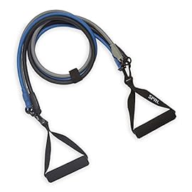 CUSTOMIZABLE – 5 color-coded, 48-inch bands with attached comfortable foam handles provide various strength levels and exercises in one set: Green (2-5 lb), Yellow (5-8 lb), Red (8-12 lb), Blue (12-16 lb), Black (16-20 lb)