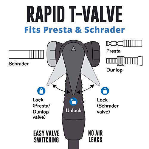 Rapid T-Valve: Presta valve bike pump also inflates Schrader valves, with a simple flick of a switch. The “Rapid T-Valve” on the bike tire pump seals strong with no annoying leaks