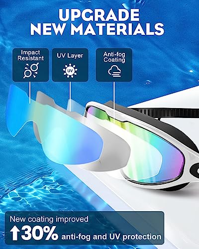 [Large frames & Excellent Clarity]-Our specially designed adult swim goggles feature a large panoramic frame that not only provides a wider field of vision but also ensures a comfortable fit without causing undesirable raccoon eyes from extended use. Additionally, the lenses of swim goggles for men are equipped with high-light transmission technology, allowing for an expansive field of view and optimal performance, so you can fully immerse yourself in the swimming experience.