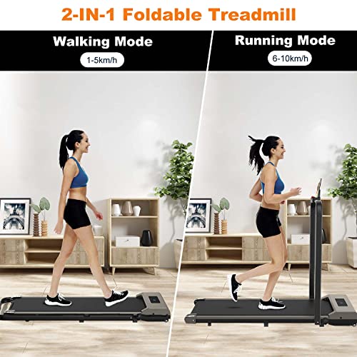 Gywowken 2 in 1 Folding Treadmill – Our treadmill features foldable handrail that allows you to switch between two different forms, ideal for various usage scenarios. Simply fold the handrails down to transform the treadmill into an under desk walking pad, perfect for walking at speeds between 0.6-2.5MPH (1-4km/h). When you’re ready to kick up the intensity, raise the handrails to access jogging and running speeds of 0.6-6.2MPH (1-10km/h)