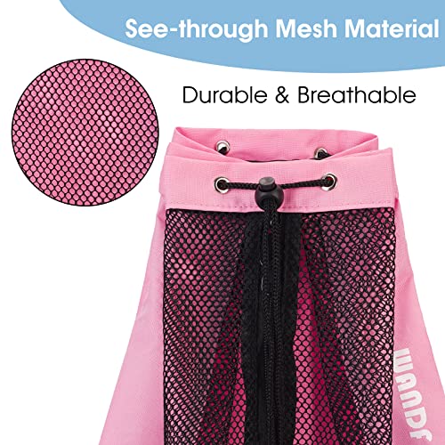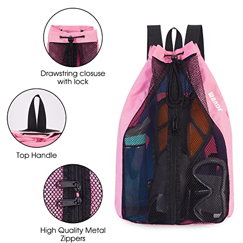 WANDF Mesh Swim Backpack is perfect to carry all your snorkel/swim/ beach/gym gear in one bag. It features a main compartment for storage and weave mesh provides breathability while allowing items to dry quickly. Soft yet tough shoulder straps ensure comfort and durability, while barrel-lock closures provide quick and easy access to your gear and secure and tight closure.